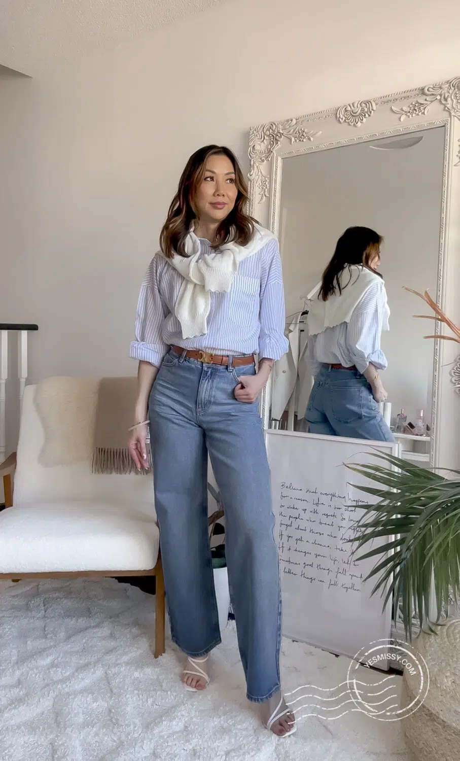 I’ve given this classic look a bit of that old money aesthetic with some understated accessories like this Celine Triomphe belt and simple gold jewelry. I’ve also draped a cardigan over the shoulders to elevate the look even further.